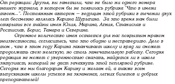 Это всё, что я хотела рассказать тебе, мой читатель! Теперь об именах твоих друзей тебе будет поведывать кто-то другой, но о том кто это будет, ты узнаешь только в следующем году. Я прощаюсь с тобой и желаю весело провести летние каникулы.